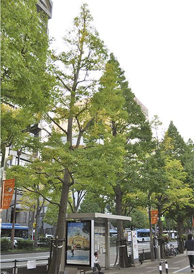 全長約400メートルの市役所前通りの沿道には、74本のイチョウの木が植えられている。このうち、雌木は33本ある。