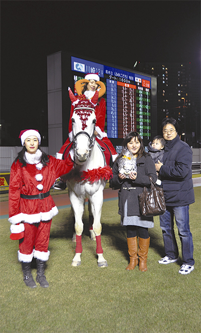 これは、川崎競馬場名物誘導馬の仮装で、ファンサービスの一環。クリスマスに近い今開催では誘導馬騎手がサンタに、誘導馬がトナカイに扮した。事前に申し込みのあったファンと一緒に記念撮影し、サンタからクリスマスプレゼントが手渡されると、参加者からは笑顔がこぼれた。