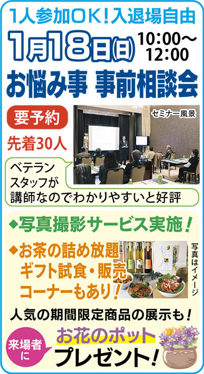 川崎区の綜合葬祭式場『平安会館わたりだ』は1月18日(日)、「相続」と「互助会」のセミナーを開く。参加無料。午前10時から正午まで。先着30人。要予約。参加者にはエンディングノート、お花のポットをプレゼント。