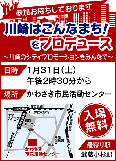 説明会は1月31日(土)午後(説明ブース出展は午前10時から午後4時)、かわさき市民活動センター(中原区)で開催される「ごえん楽市」で行う。「説明会ではシティプロモーション全般に関する疑問・質問も当日受け付けます。気になることがありましたら、お気軽にどうぞ」と市では参加を呼びかける。詳細は、川崎市市民こども局 シティセールス・広報室(【電話】044・200・2473)。