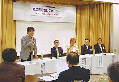商店街の今後の在り方などを考えるフォーラムが先月25日、ホテル精養軒で開催され、中原区の地元の商店主や企業主ら約60人が参加した。
