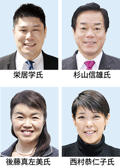 立候補の意思を表明しているのは、自民党現職・杉山信雄氏(57)▽民主党現職・栄居学氏(37)▽公明党現職・西村恭仁子氏(52)▽共産党新人・後藤真左美氏(48)。