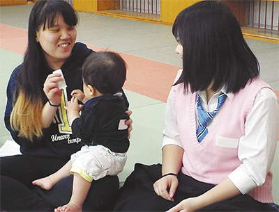 授業を企画した大谷彩美教諭は「自分が親になったときの心構えを持ってもらいたい。保育士を目指す生徒には、大事な子どもを預かるその後ろには大変な思いをしているお母さんの存在があるので、子どもが好きという気持ちだけではできないという現実を知ってほしかった」と話した。