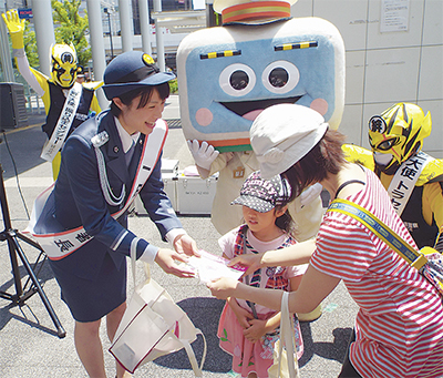 また、この日は女子バレーボールチーム「NECレッドロケッツ」の近江あかり副キャプテンが一日警察署長を委嘱された。近江さんは、痴漢撃退シールを道行く女性らに配布しながら被害の防止を呼び掛けた。 近江さんは「バレーの試合では瞬時の判断と勇気が大切。万が一被害に遭ったら、勇気を出して声をあげて」と話していた。