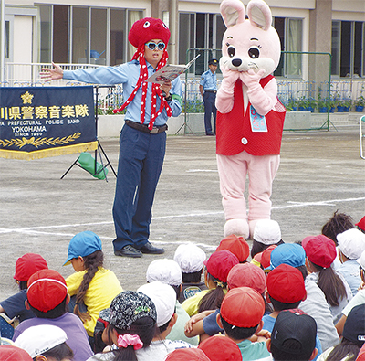 川崎警察署(鳴海達之署長)は東門前小学校(松野進校長)で16日、小学生に防犯を教える「おおだこポリス子ども安全スクール」を実施した。県警本部、広報県民課音楽隊と合同で行い、防犯寸劇や音楽隊の演奏等を全校生徒約1000人の前で披露した。