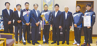 南渡田町を拠点に活動するJFE京浜水泳部が先月28日、福田紀彦市長を表敬訪問し、第66回日本実業団水泳競技大会での3連覇を報告した。