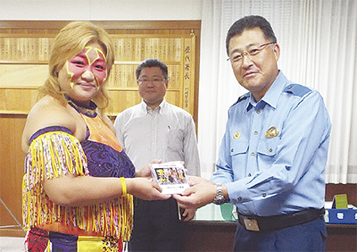 殿町に拠点を置く「ワールド女子プロレス・ディアナ」の井上京子代表が9月17日、川崎警察署を訪れ振り込め詐欺抑止を啓発する内容の動画を収めたDVDを寄贈。鳴海達之署長=写真右=に手渡した。DVDの作成を手掛けた川崎銀座商業協同組合の小林一三理事長、(株)ワイエスシーの安西光徳さんも出席した。