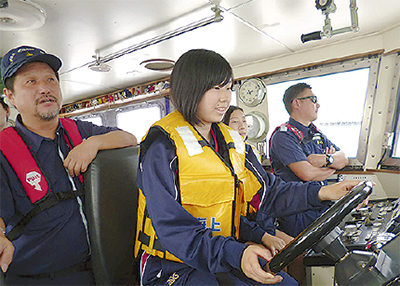生徒らは巡視艇に乗って川崎港を航海し、自らハンドルをにぎり運転を体験。海では採水も行い、海の環境を守るために同暑が行っている水質分析もした。警備業務の体験では、指紋の種類について説明を受けながら、署員さながら鑑識作業。船内での火災を想定した救難業務体験では、面体と呼ばれるマスクとヘルメットを装着し、酸素ボンベを背負って要救助者を運び、心肺蘇生法を学んだ。