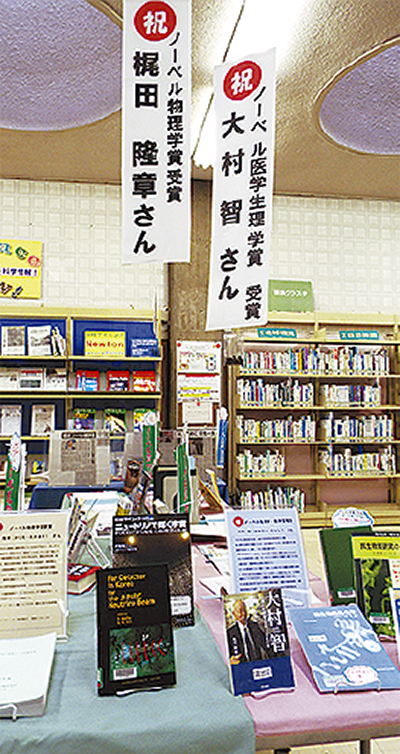 富士見にある神奈川県立川崎図書館はノーベル医学・生理学賞を受賞した大村智北里大学特別栄誉教授と物理学賞を受賞した梶田隆章東京大学宇宙線研究所長の業績をたたえ、同館が所蔵する2人の著書や文献などの資料を展示するコーナーを開設している。