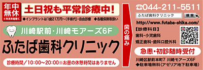 川崎駅前の川崎モアーズ6階にある「ふたば歯科クリニック」。同院は13人の歯科医が年中無休、お昼の休憩なしで土日祝日も診療にあたる。「やさしく丁寧な診療・みえる、わかりやすい治療」がモットーで急患にも対応。保育士資格や幼稚園教諭の免許を持つスタッフもおり、女性歯科医には矯正やホワイトニングなど審美の相談が多い。初診に限りネット予約も可能だ。