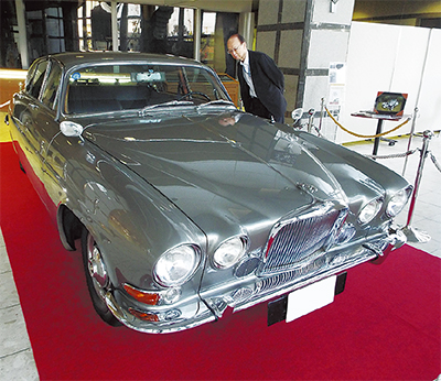 展示車は1963年製造の「ジャガー・マーク・テン」。全長5100㎜、全幅1938㎜、全高1380㎜と迫力ある車体で、現在世界に10台ほどしかないと言われる型だという。