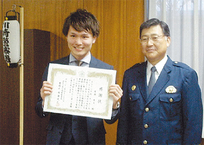 渡田山王町在住の廣瀬秀文さん(会社員・25歳)が、日進町で3月に起きたひったくり事件で容疑者を追跡し取り押さえ、逮捕に貢献した。川崎警察署(鳴海達之署長)は4月26日に功労に対し感謝状を贈呈した。