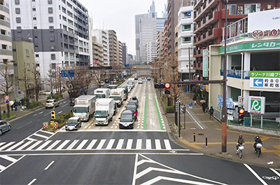 このうち、産業道路方面に向かう最左車線では左折車両が自転車横断体を通行する自転車と交錯し、渋滞を引き起こしていた。通過時間は最大で5分48秒かかり、渋滞の長さは170メートルに達したという。