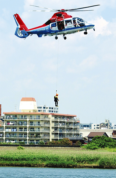 川の氾濫時に水を食い止める土のうの作成や大雨による道路冠水を想定した訓練のほか、多摩川に溺れている人がいる想定で、消防局のヘリコプターから人を吊り上げる水難救助訓練を行った。参加者は真剣な面持ちで取り組んでいた。