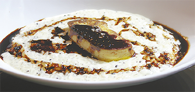 「トリュフリゾット、フォアグラポワレ添え」は、濃厚なクリームチーズのリゾットに高級食材のトリュフとフォアグラを贅沢に使用した(税抜1100円)。