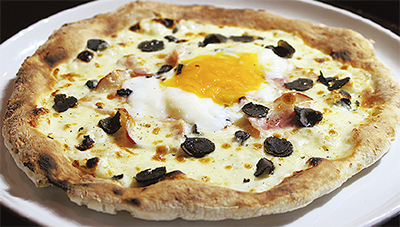 本格窯のアツアツ石焼ピッツァも登場。「黒トリュフと半熟卵のピッツァ『タルトゥーフォ』」(税抜1580円)は、黒トリュフを一面にまぶし、半熟卵を乗せる。シェフの飯澤明宏さんによると、2つの食材は相性が抜群で自慢の一品だという。