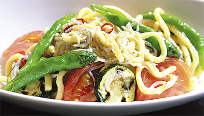 旬な夏野菜をグリルし、本場の静岡産シラスと自家製の太い麺「ビゴリ」を絡めた「しらすと夏野菜のペペロンチーノ」(税抜1080円)。見た目も鮮やかでヘルシーな逸品。