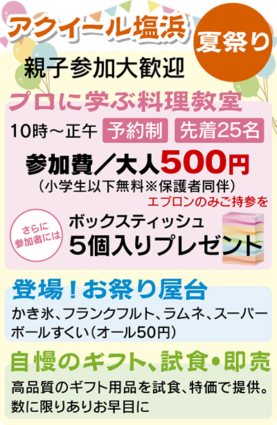 当日は、同館仕出し料理平安の原口料理長から学べる料理教室が開かれるほか、かき氷、フランクフルト、ラムネ、スーパーボールすくいなども出店。さらにギフト商品の試食特価販売も予定されている。