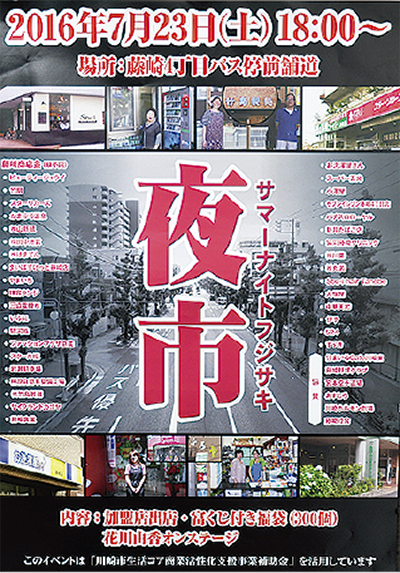 藤崎商店会(田中裕会長)は「サマーナイトフジサキ夜市」と銘打った夏祭りを今月23日(土)、藤崎4丁目バス停前の舗道で開催する。