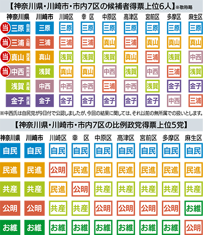 トップ当選の自民・三原氏は、市内7区全てで最も得票が多く市全体の約25%にあたる16万3605票を獲得。2位当選の公明・三浦氏は、川崎区、幸区、高津区で2番目に得票が多かったが、中原区で5番、麻生区で6番と地域で差が出た。市全体で9万6843票を獲得した。3位当選の民進・真山氏は、川崎区、幸区で4番だったが中原区、宮前区、多摩区、麻生区で2番の得票数となる9万5727票だった。4位当選の中西氏は麻生区で3番目に得票が多かったのが最高で川崎区、幸区、高津区、多摩区では5、6番目となり、市全体の得票順位は5番目の7万5440票。次点だった共産・浅賀氏は、川崎区、幸区、中原区、多摩区で3番目の得票数となり、市全体での順位は4番目の得票数となる8万7524票だった。民進・金子氏は、多摩区・麻生区で5番目だったが他5区で6番となり、市全体では6万4333票となった。