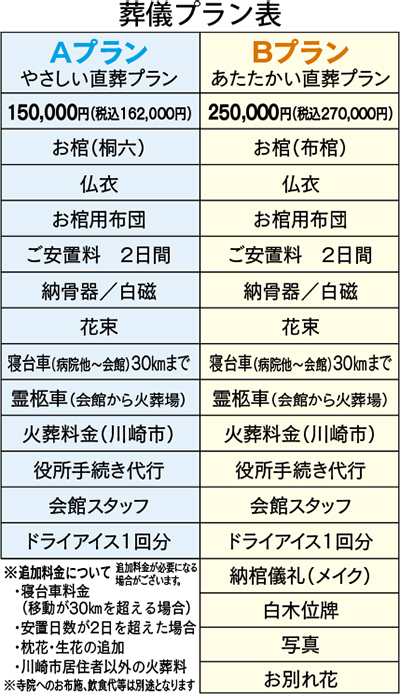 また当初、火葬のみの予定から10人程度の家族葬に切り替えることも可能。その際も明朗な料金体系で対応してくれる。プランは2種類(別表)。いずれも分かりやすく、遺族の負担も少ないと評判を呼んでいる。
