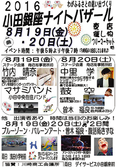 小田銀座商店街協同組合(小泉忠行理事長)は「小田ナイトバザール」と題した夏祭りを8月19日(金)と20日(土)の午後5時から7時に同商店街で開催する。