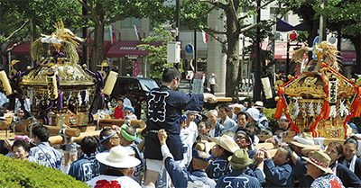 神輿の集結地で連合渡御の観覧スポットとしても知られる川崎市役所本庁舎前駐車場=写真=はこの秋から建て替え工事が行われるため、今回が見納めとなった。沿道に詰めかけた大勢のギャラリーは神輿の動きに合わせて手拍子や声をかけつつ、名残を惜しんでいた。