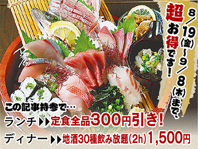 この記事を持参した人・グループ限定となる夏のサービスはランチ時の「定食全品300円引き」とディナー時の「地酒30種飲み放題1500円」。昼は海鮮などの海の幸、夜はこだわりの地酒各種、暑い季節に嬉しい割引となっている。