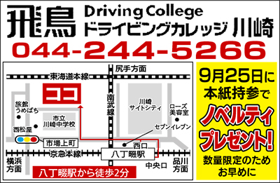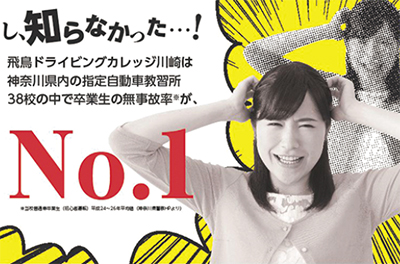 飛鳥ドライビングカレッジ川崎校は卒業生が県内指定の自動車教習所38校の中で、普通車に乗る初心運転者の無事故率※がNO・1に。同校は9月21日(水)から始まる秋の交通安全週間に合わせて「交通安全フェア」を9月25日(日)午前10時から同校で開催する。