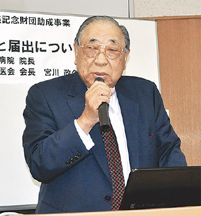 医療法人誠医会・宮川病院の宮川政久院長は、9月29日にプラザ大師で開かれた、介護・医療関係者ら向けの講演会「最後まで穏やかに過ごすために〜終末期をどう支えるか〜」(主催・大師地区地域包括ケア研究会)で、在宅での患者の看取り方についてアドバイスを行った。