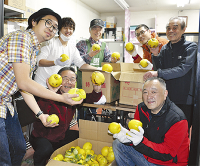 桜本商店街入り口付近に歩道にある約10本のカリンの木が実をつけ、今月12日、同商店街と若者ボランティア=写真上=による収穫作業が行われた。