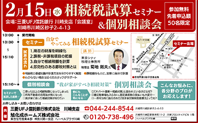 「我が家の場合、相続税はいくらになるの―」。「相続」を取り巻く環境が大きく変わる中で、家族に資産を円滑に承継するには最新の情報収集と事前の準備が重要。三菱UFJ信託銀行とへーベルプラザ川崎が共催して2月15日(水)、三菱UFJ信託銀行川崎支店・会議室(川崎区砂子2の4の13)を会場に「自分でやってみる 相続税試算セミナー」を開催する。参加無料。当日は税務のプロが相続税の基礎知識や計算方法を分かりやすく解説するほか、課税額をもとに実際に自分で相続税額を計算。試算で現状を把握した後は、即効性のある節税対策の解説も行う。参加者は固定資産税の課税明細書(不動産一覧の記載のあるもの)、電卓、筆記用具の持参を。セミナー終了後は「我が家がすべき相続対策 個別相談会」を開催。セミナーの試算結果で思った以上の相続税額になってしまった人や、我が家に合った相続対策が知りたい人などにとって、各分野のプロに個別相談できるチャンスだ。所有不動産の有効な活用方法や、一昨年施行された「空き家対策特別措置法」を知りたい、駐車場を持っているが、固定資産税の支払いが大変…などの悩みもこの機会にぜひ相談を。なお、セミナーは50名限定なので早めに申し込みを。当日参加できない人にはセミナー資料を進呈中。まずは左記へ。