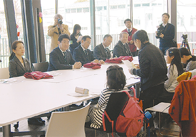 市内子ども議会のメンバーが2月11日、麻生区の田園調布学園大学で福田紀彦市長らと意見交換を行い、児童の目線で検討された町づくりに関する請願書を手渡した。