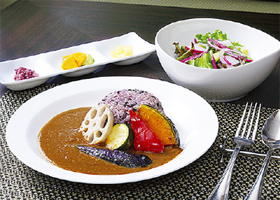メニューはプレートランチとカレーの2種。いずれも野菜やサラダが豊富な上、黒米ともち麦ごはんを使ったヘルシーさがウリ。「いずれは地場野菜を使ったメニューも提供したい」とも語る。ティータイムにはホームメイドのスイーツも楽しむことができ、女子会にもうってつけ。