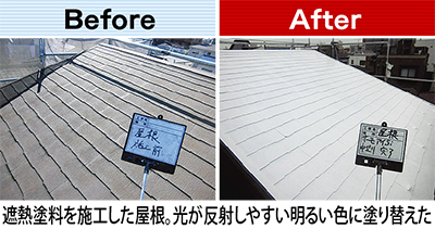 河田社長によると、遮熱塗料を屋根に塗ると、太陽光を反射させるため屋根に蓄積する熱を抑えることができる。その結果、室内へ伝わる熱が軽減するという。メーカー調べでは、塗った場合はおおよそ2度から6度程度下がる。