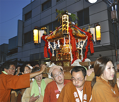 例大祭に合わせて20日に氏子町内会による連合渡御が行われた。8町内会から9基の神輿が浅田小学校の校庭を出発。太鼓や笛の音が鳴り響く中で、町内会ごとに揃いのはんてんを着た担ぎ手たちの「エイサー、オイサー」の掛け声に合わせて、商店街「マイロードおだ」を経て小田小学校まで練り歩いた=写真。