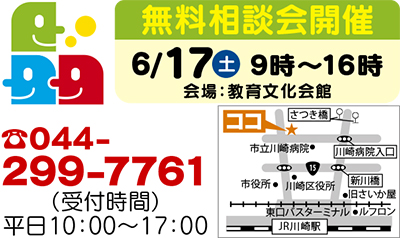 そんな悩みを抱える人に、地元川崎を中心に活動する弁護士や税理士、司法書士など専門家10人が所属する(一社)川崎市民相談会が6月17日(土)、「無料相談会」を川崎市教育文化会館(川崎駅東口徒歩15分)で開催する。9時から16時まで。