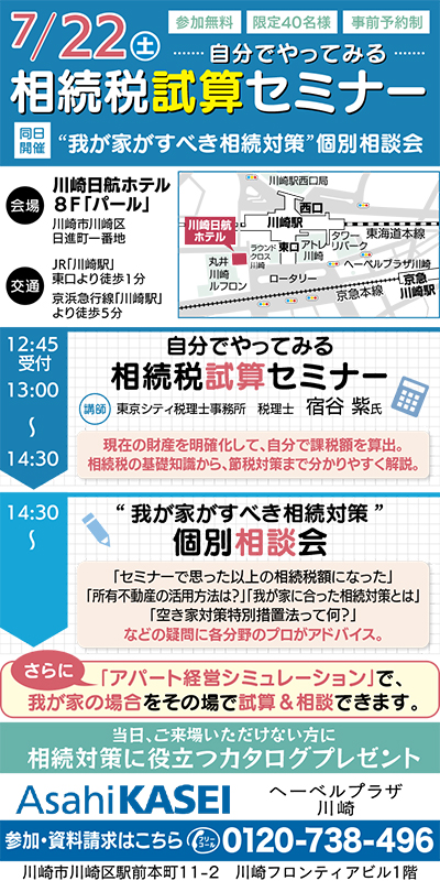 「我が家の相続税、実際いくらになるの」と疑問を持つ人も多いのでは。旭化成ホームズ(株)では、そんな人の悩み解消してもらおうと7月22日(土)、午後1時から川崎日航ホテル8階「パール」で「自分でやってみる!相続税試算セミナー」を開催する。参加無料。先着40人限定(要予約)。