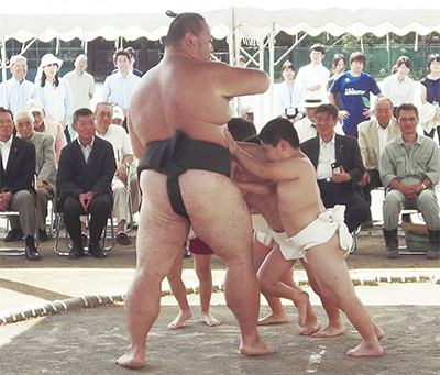 土俵開きには中川部屋の春日龍、春光、義春日の3力士が参加。ぶつかり稽古を披露したほか、児童と熱戦を繰り広げた。