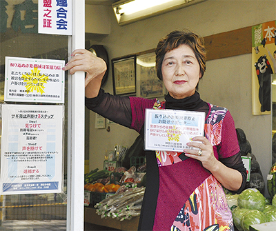 川崎区追分町の青果店「橋本商店」の女将・橋本桂子さんがこれまで3度にわたり、隣接する無人ATMで振り込め詐欺を防いだことが契機となり、神奈川県警はATMが見通せる場所に立地する商店に「振り込め詐欺撲滅対策協力店」のステッカーを交付した。ステッカーを手に「安心して声掛けできる」と橋本さんは喜ぶ。