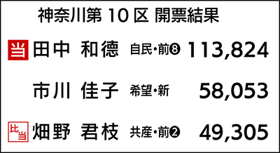 第48回衆院総選挙が22日投開票され、3人が立候補した神奈川10区(川崎区・幸区・中原区の一部)は自民党前職の田中和徳氏が8度目の当選を果たし、共産党前職の畑野君枝氏は比例復活した。