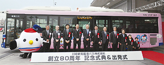 「臨港バス」として親しまれ、川崎南部の市民の足として走り続けてきた川崎鶴見臨港バス株式会社(田中伸介取締役社長)が18日に創立80周年を迎え、塩浜営業所で記念式典とラッピングバスを披露した。