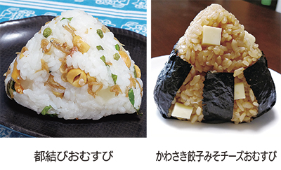 「都結びおむすび」は、川崎区の迫直美さんが考案。東海道川崎宿が東京と京都の2つの都を結ぶことから、東京のべったら漬けと京都のちりめん山椒を具材にした作品。
