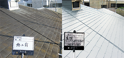 遮熱塗料を屋根に塗ると太陽光を反射し、屋根に蓄積する熱を抑えることができる。そのため室内に伝わる熱が軽減し、メーカー調べでは塗った前後で2℃から6℃の差がでるという。