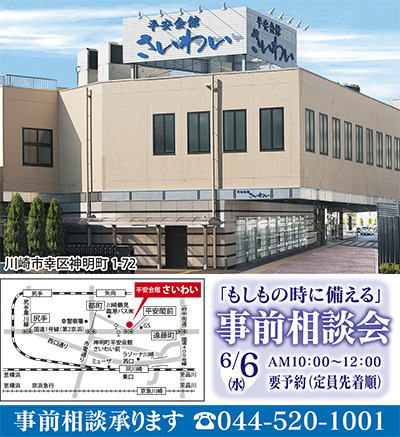 葬祭式場「平安会館さいわい」=幸区神明町=の取り組みを紹介するコーナーの第10回目。昨年50周年を迎えたセレモニアグループでは、市内に9つの葬祭式場を運営しており、その中でも同館は小規模な家族葬から大型葬まで対応できるホールを有する会館として知られている。スタッフの石原征司さんに話を聞いた。