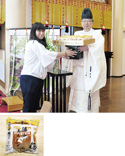 箱根ベーカリー川崎アゼリア店は今年4月から地元の稲毛神社(市川緋佐麿宮司・川崎区宮本町)に「勝栗あんパン」の奉納をしている。毎月15日に30個奉納するという。