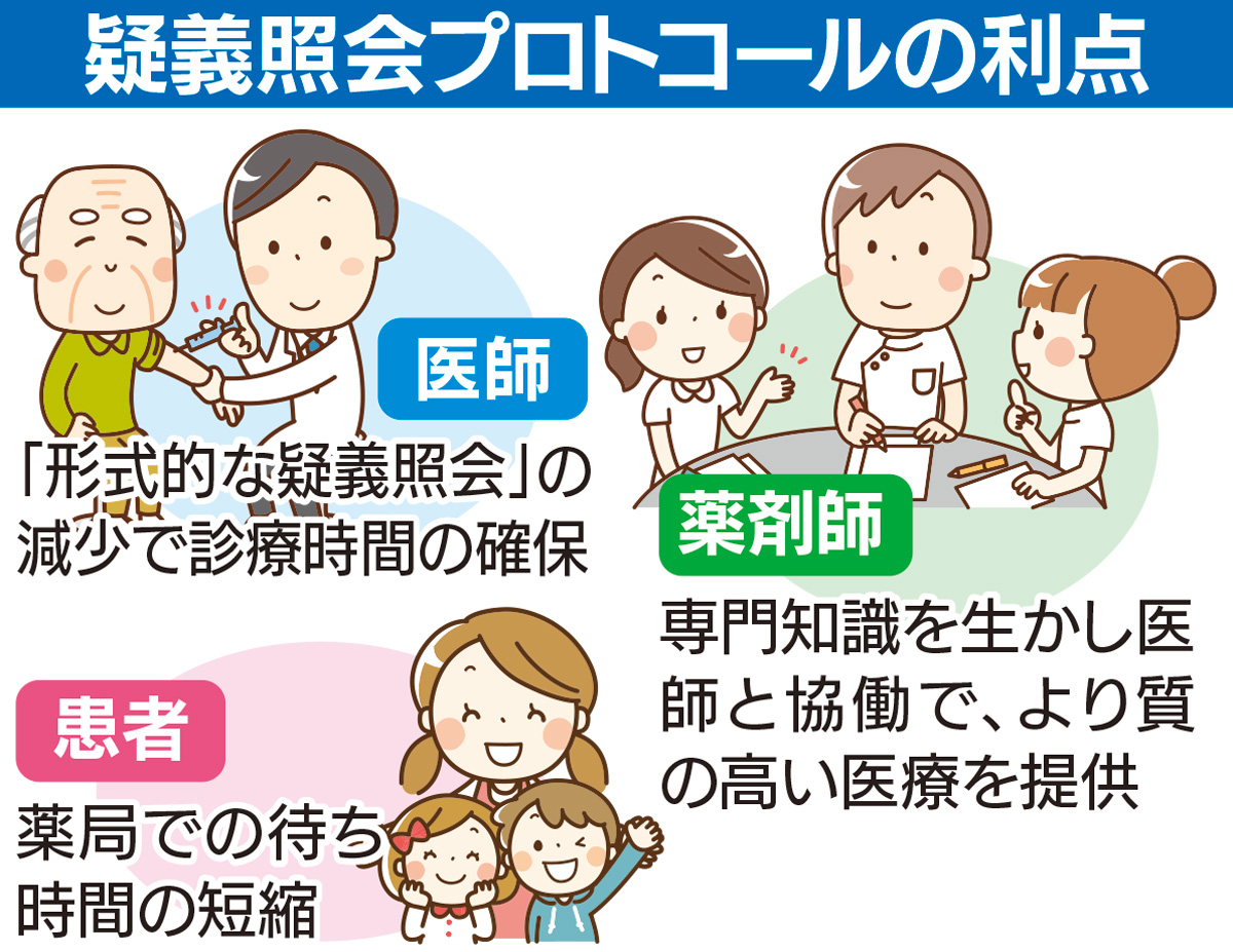 「疑義照会プロトコール」では、事前に決めた範囲の変更については疑義照会を省き、薬剤師の判断で可能になった。市薬剤師会は「疑義照会は医薬品の適正使用のため重要だが、患者の待ち時間が延びたり、病院によっては1日100件を超える疑義照会への回答が医師の負担にもなっている」と指摘する。