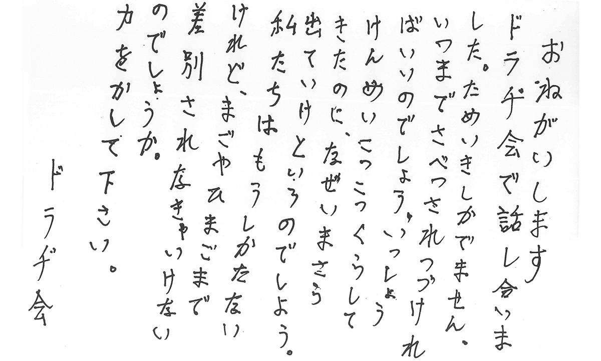 同ネットワークは12日、市にガイドラインの適正運用と人種差別撤廃条例の早期制定を求める要望書と在日高齢者クラブ「トラヂ会」のハルモニ(おばあさん)たちの手紙を提出した。手紙には正面から差別と向き合うよう綴られている。