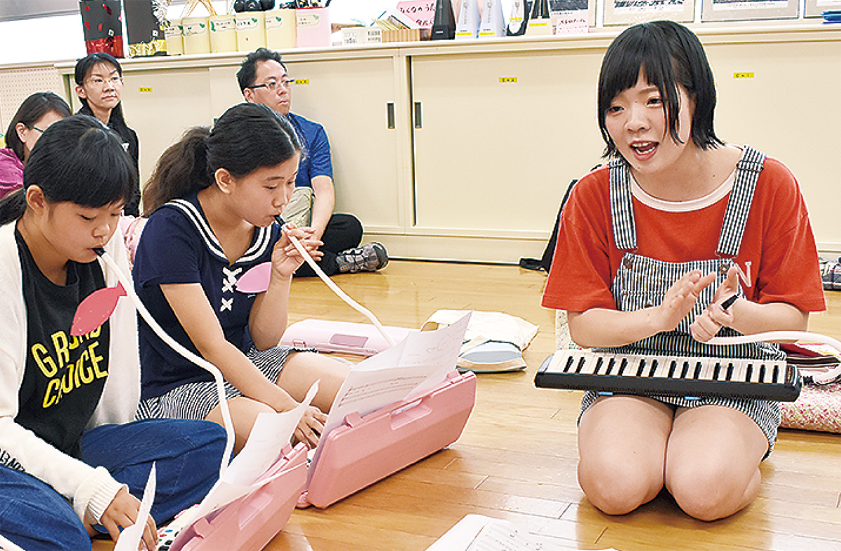 この日のためにメンバーが用意した名札とアレンジした楽譜を子どもたちに手渡し、鍵盤ハーモニカのアルトとソプラノ、打楽器の3パートに分かれて練習。メンバーにリードされ複雑なリズムやメロディに挑戦し、ほめられてはにかむ子もいた。参加した矢石琴乃さん(小6)と母親は「優しく教えてくれて嬉しかった」「学校でこういう機会を作ってもらえていい体験ができた」と話した。