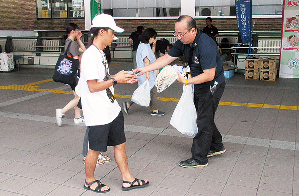 活動には同会の事務局員や会員、神奈川県警の職員など合わせて28人が参加。1時間で約2000人の通行人に「NO DRUG」と書かれたうちわやチラシ、経口補水液ゼリー、絆創膏などを配布した。